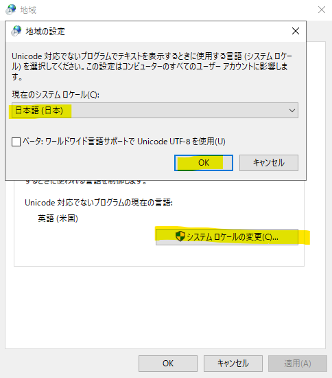 「Unicode 対応でないプログラムの現在の言語」が、日本語以外の言語 (例:英語(米国)) になっていないでしょうか?