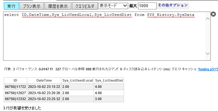 selectID,DateTime,Sys_LicUsedLocal,Sys_LicUsedDist from SYS_History.SysData