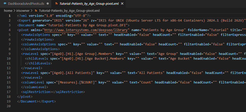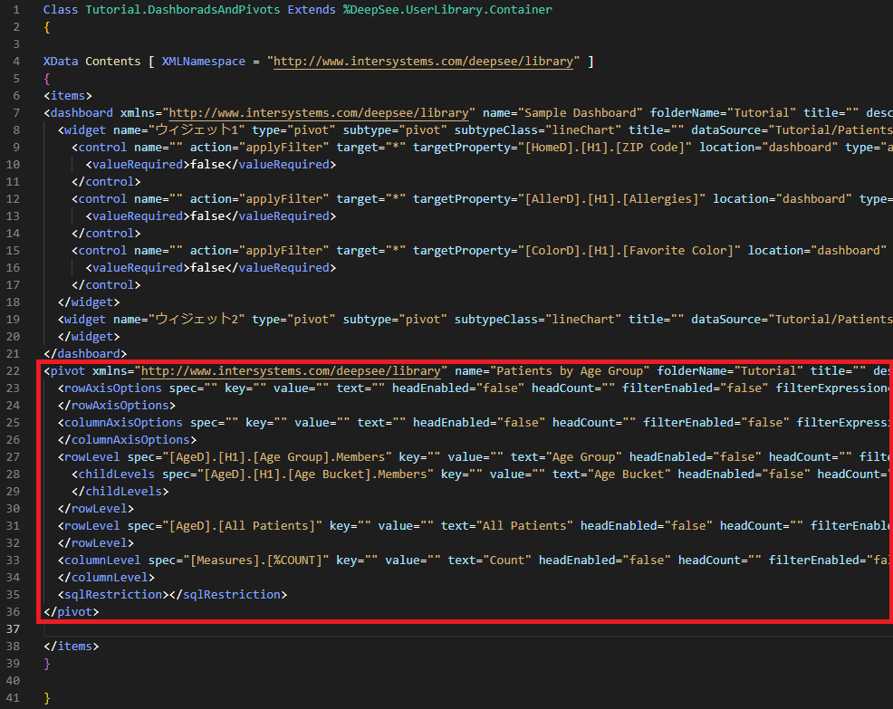 次に、Tutorial-Patients_by_Age_Group-pivot.xml を開きます。先ほどのダッシュボードのxmlに似ていますが、<dashboard> の代わりに <pivot> というセクションがあります。