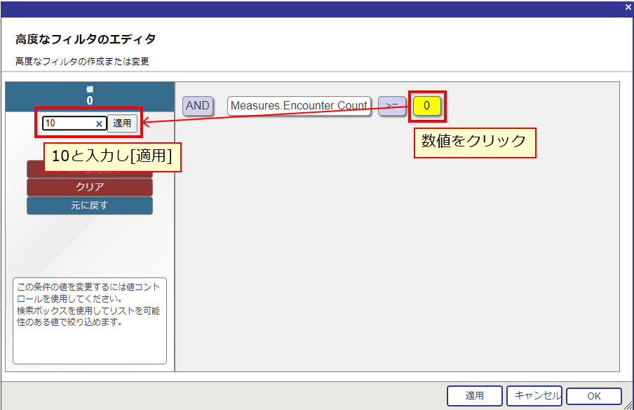 フィルタ対象項目が Measures.Encounter Count にさし替わりました。それに伴って演算子の表示も変わりました。