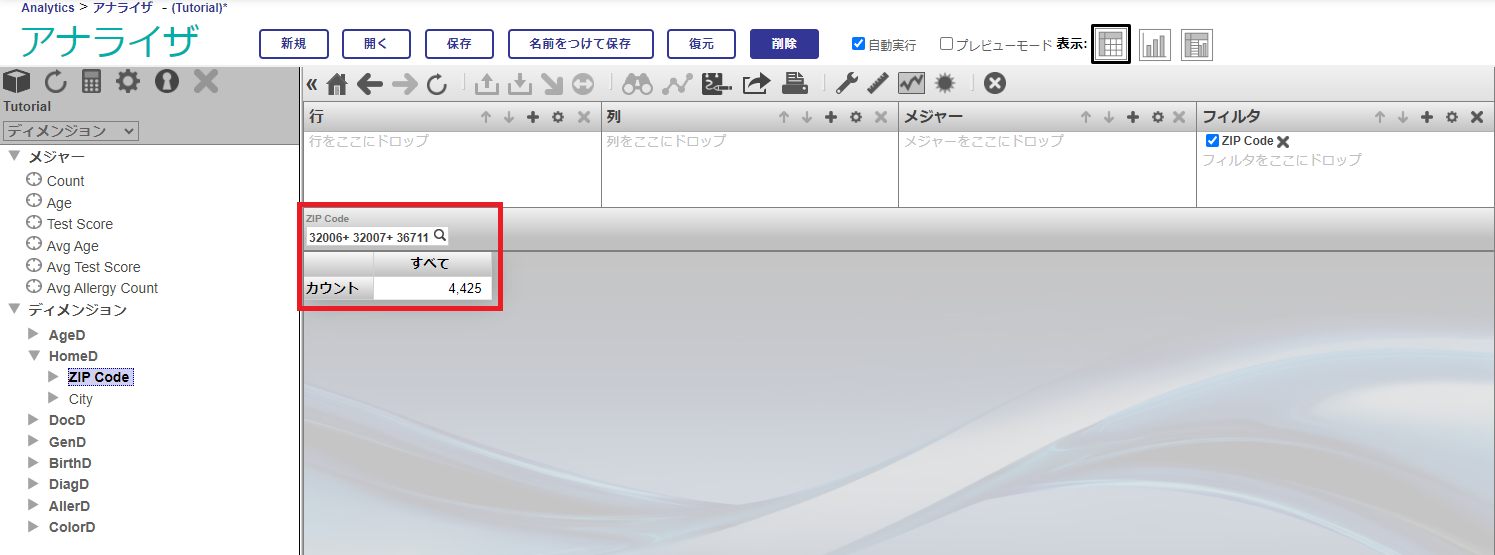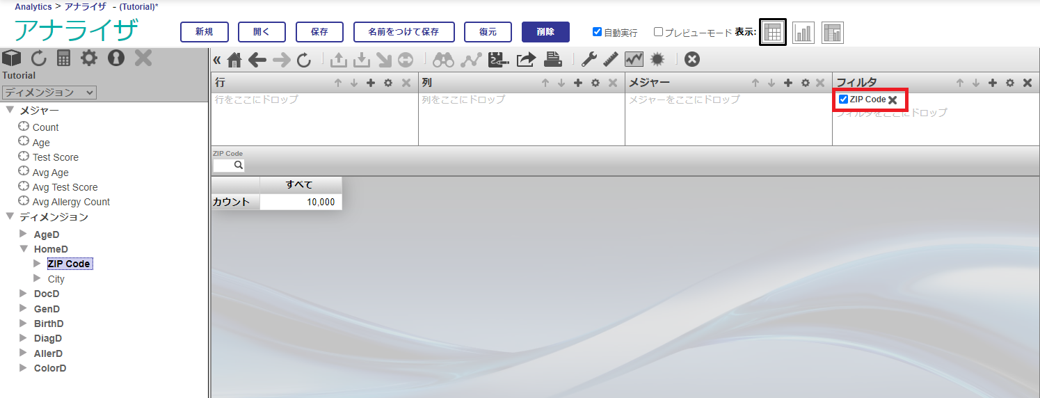 ではここに、郵便番号のフィルタ条件を追加していきます。それに必要な情報を取得するために、別ウィンドウでアナライザ画面を立ち上げ、Tutorialキューブを開きます。