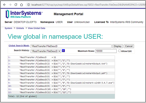 クラスメソッドRunを実行した後、最初の3つのファイルの出力では、ステータスは正常となりました。 しかし、最後のファイルでは、最初と最後の呼び出しは動作するにもかかわらず、真ん中の呼び出しはエラー: 5922を返しました。これは応答待ちのタイムアウトです。 globalsメソッドを見ると、コードが11番目のファイルを保存しなかったことがわかります。 つまり、##class(RestTransfer.Client).SendFile(filename)が失敗しています。正確に言えば、JSONからデータを取り出すメソッドが成功しなかったということです。