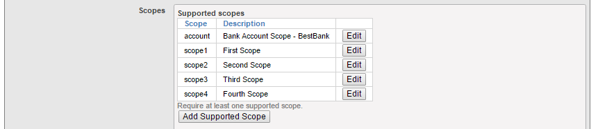 このサーバーでサポートされるスコープ(Supportted scopes)を定義します。