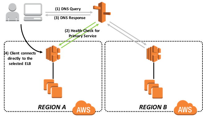 Route53 は、各エンドポイントに通常のリクエストを送信してその応答を検証することで機能します。 エンドポイントが有効なレスポンスを提供できない場合、 DNSレスポンスには含まれなくなり、代わりに利用可能な代替エンドポイントを返します。 このようにして、ユーザートラフィックは障害のあるエンドポイントから離れ、利用可能なエンドポイントに向けられます。