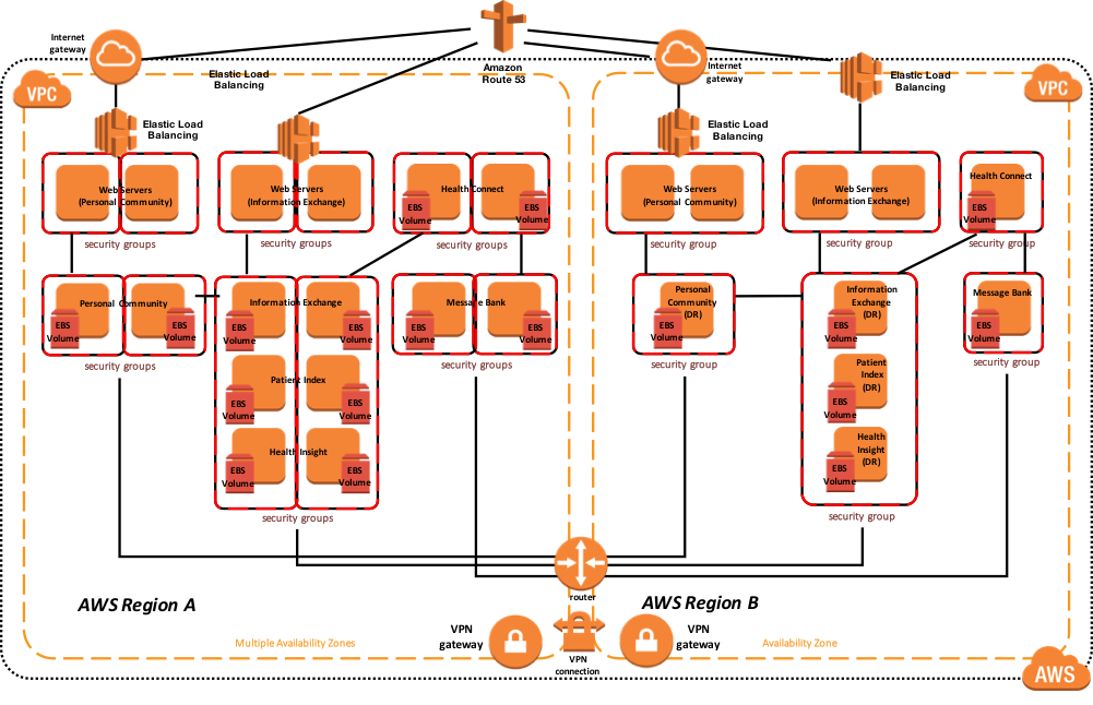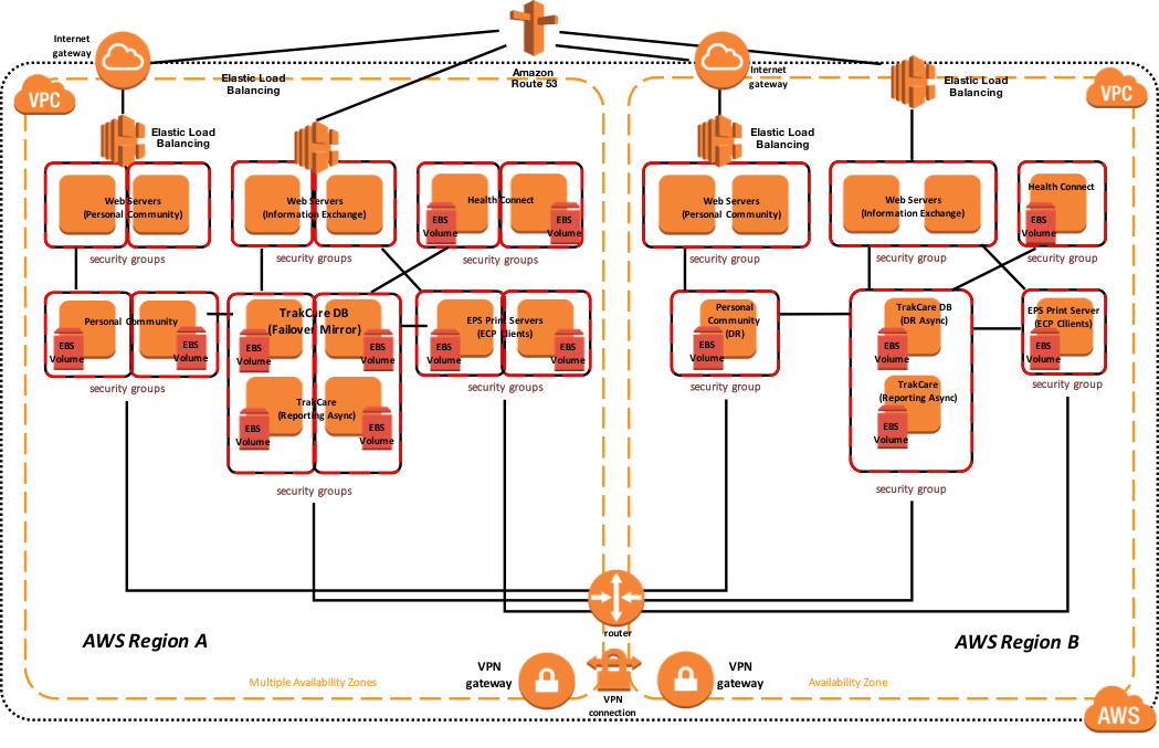 下のサンプルリファレンスアーキテクチャ図には、アクティブまたはプライマリリージョンにおける高可用性と、プライマリ AWS リージョンが利用不可である場合の別の AWS リージョンへの災害復旧が含まれます。 また、この例では、データベースミラーには、1つのミラーセット内にTrakCare DB、TrakCare Analytics、およびIntegrationネームスペースが含まれています。