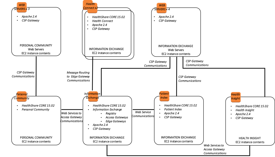 次の図は、負荷分散される複数のWebサーバーと、Information Exchange、Patient Index、Personal Community、Health Insight、Health Connectといった複数のHealthShare製品による典型的なHealthSharaeデプロイメントを示しています。 それぞれの製品は、複数のアベイラビリティーゾーン内に 1 組のデータベースミラーを含めて高可用性を実現しています。 仮想IPアドレスは、ECPまたはCSP Gatewayに関連付けられていない接続にのみ使用されます。 HealthShare製品間のWebサービス通信に使用されるCSP Gatewayはミラー対応であり、VIPを必要としません。