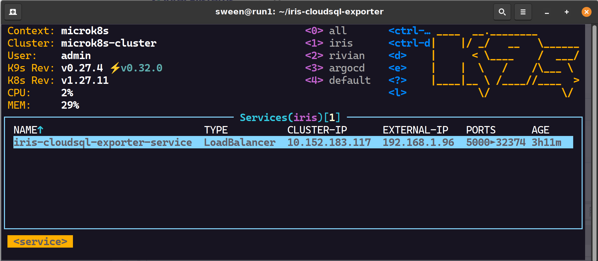 cat <<EOF | kubectl apply -f -n iris - apiVersion: v1 kind: Service metadata: name: iris-cloudsql-exporter-service spec: selector: app: iris-cloudsql-exporter type: LoadBalancer ports: - protocol: TCP port: 5000 targetPort: 8000 EOF